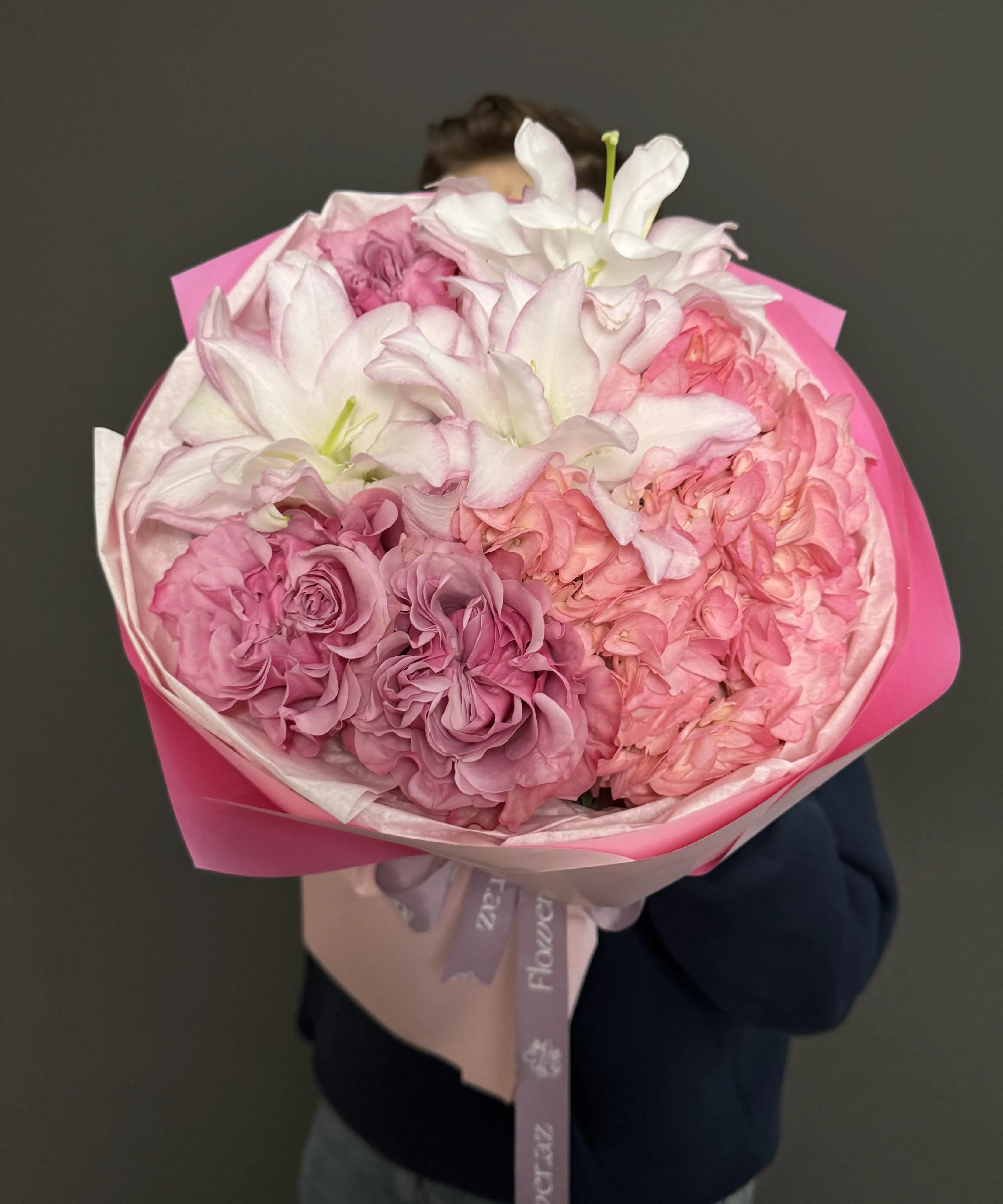 Pudra & Fuksiya Ahəngi — Hidrangea və Garden Rose Buketi