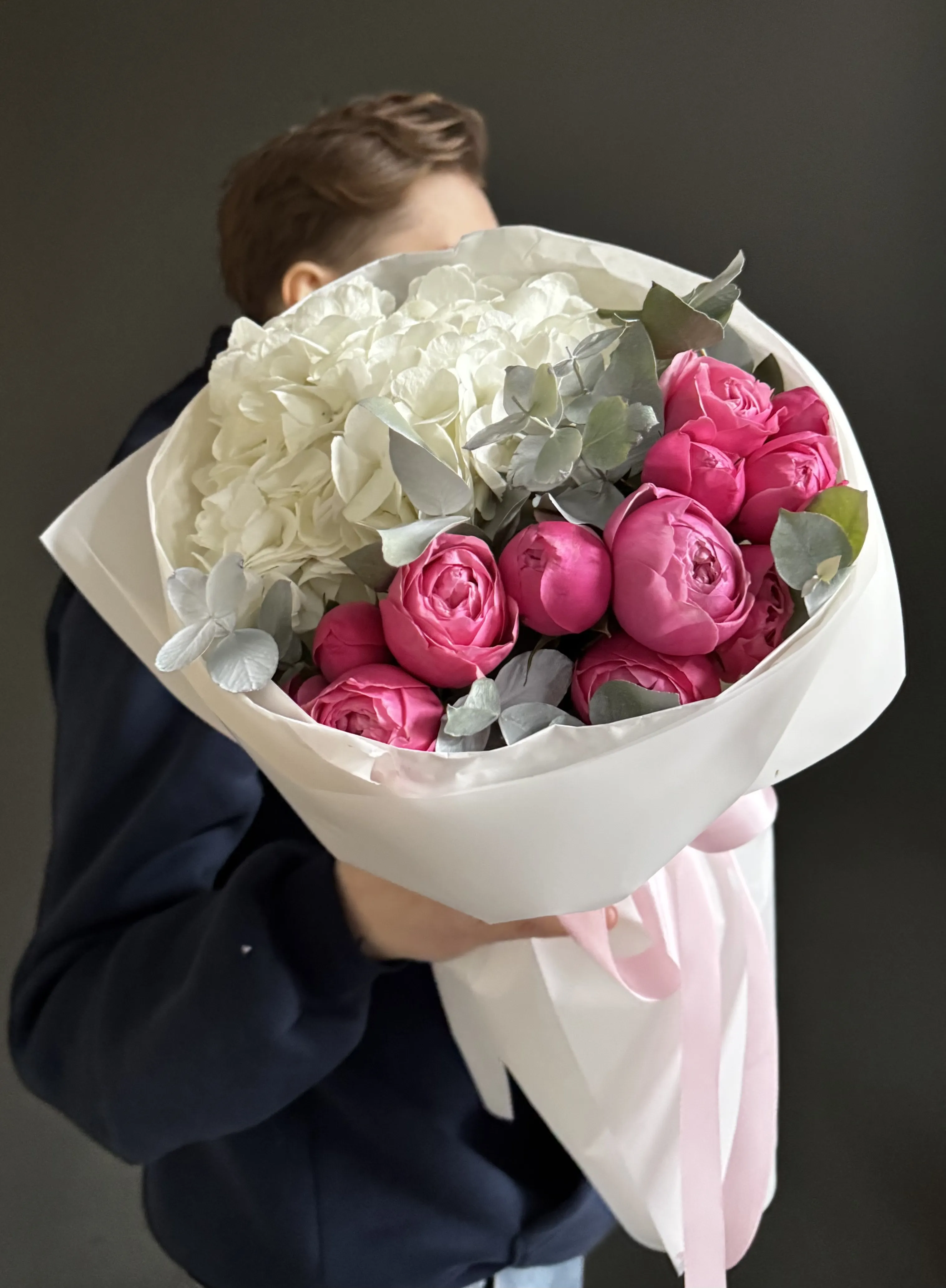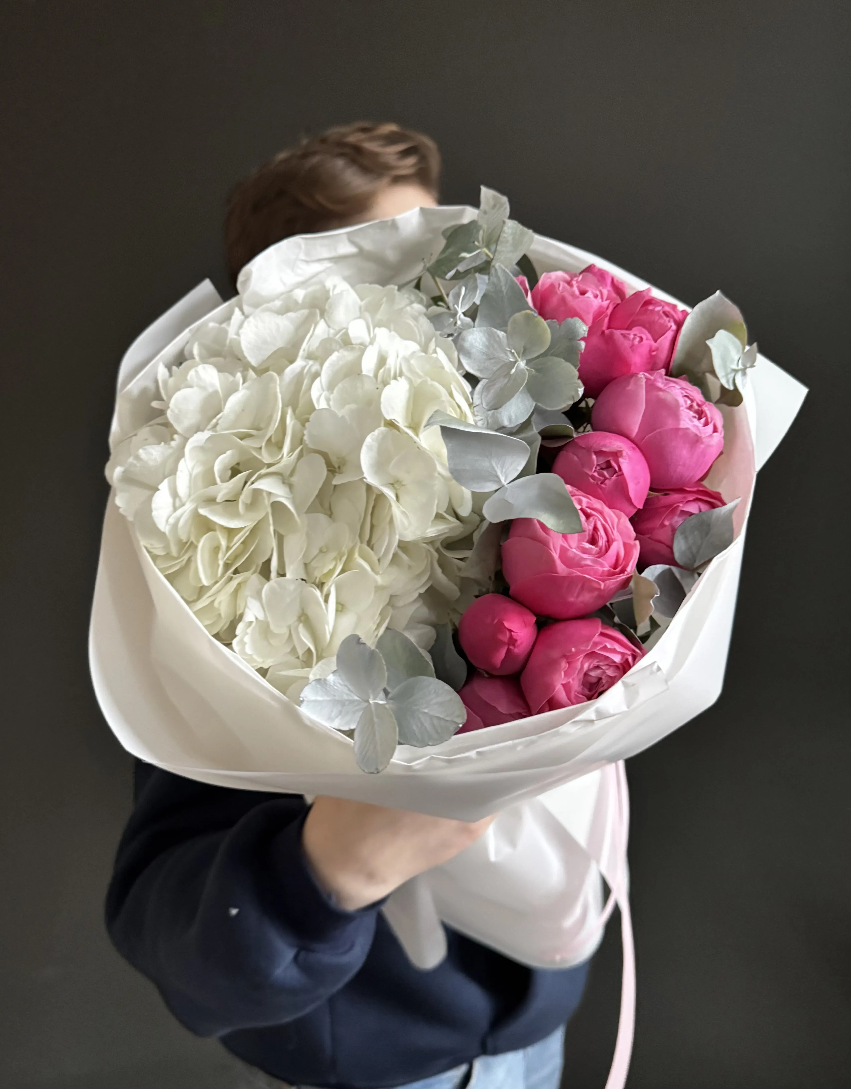 Zümrüd Harmoniya-Xrizantema, Hidrangea və Qızılgül Buketi