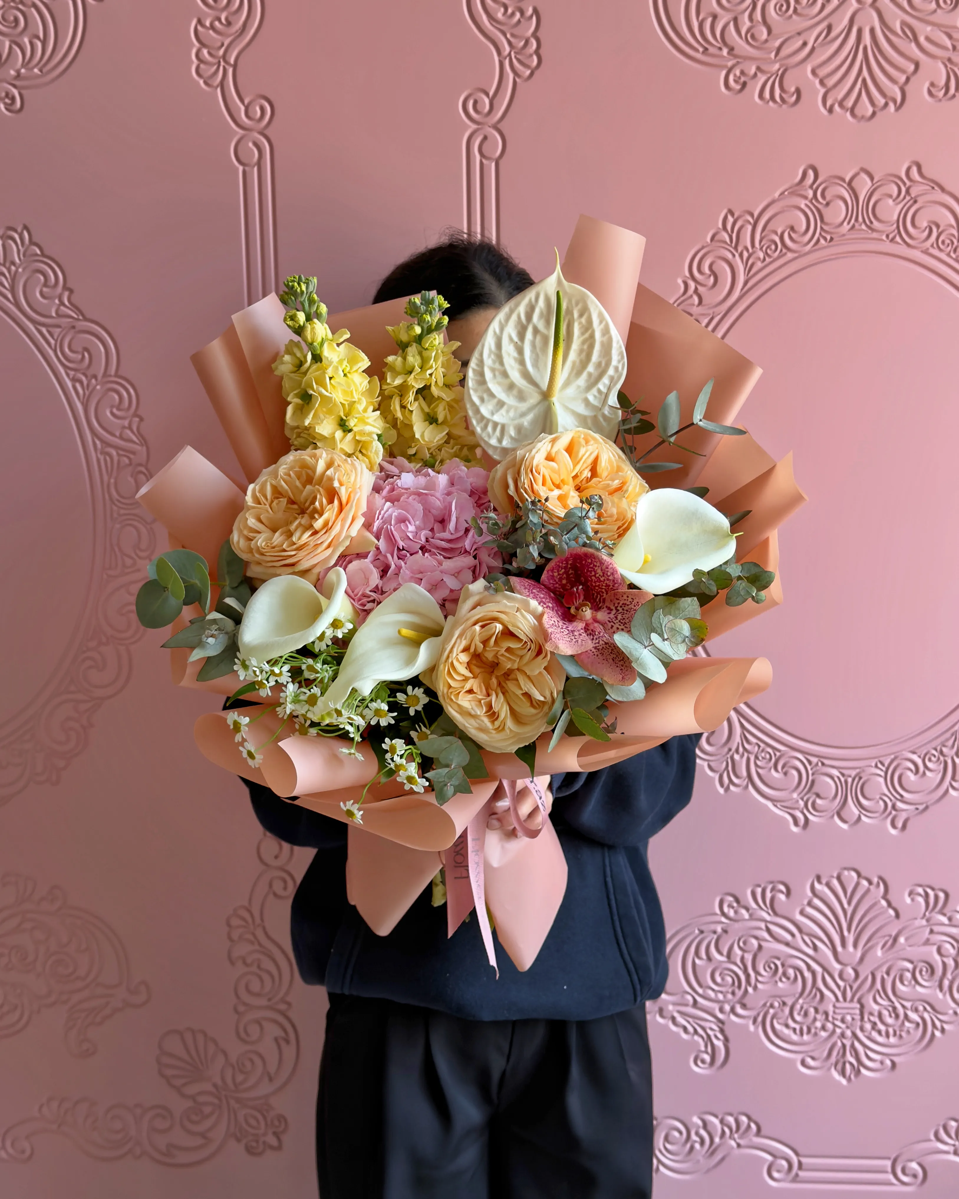 Hydrangea, Fragrant roses, Orchid, Anthurium
